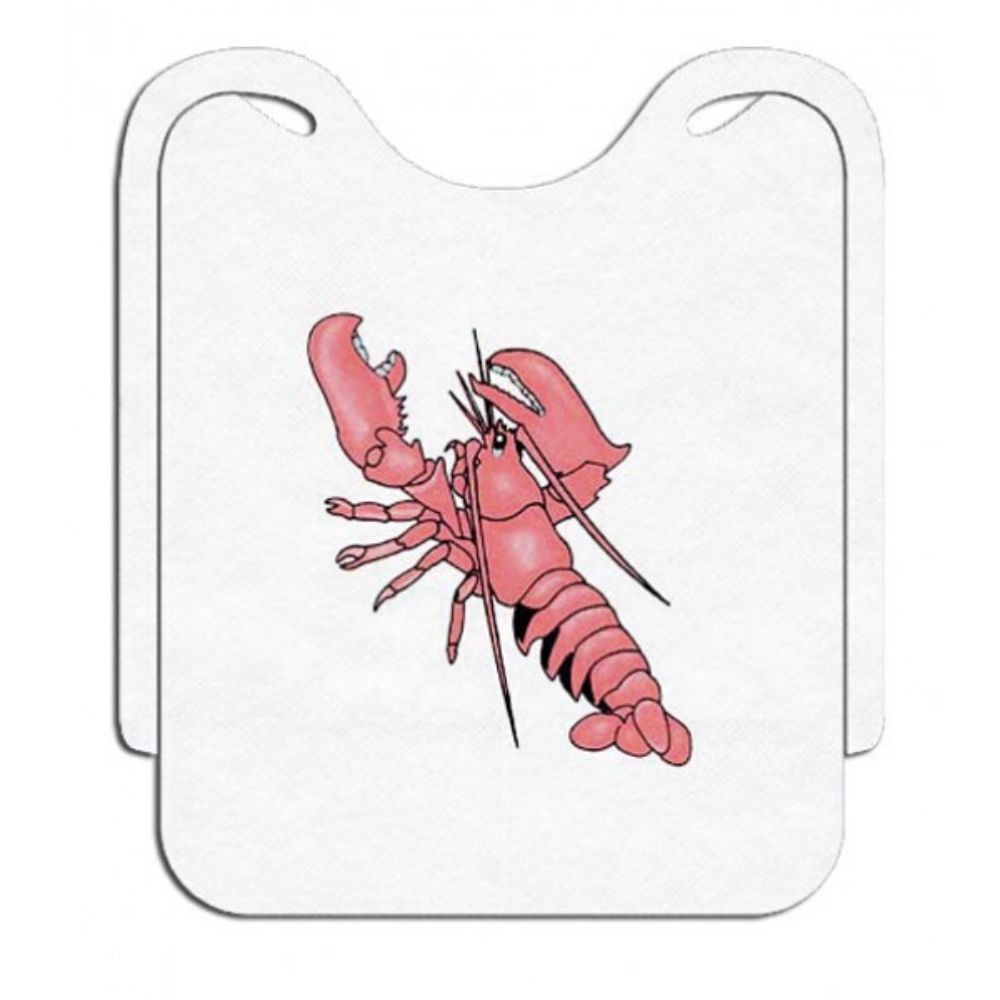 DESCRIZIONE MATERIALE: Bavaglio in TNT bianco con decoro aragosta, cm. 40×50. 1 velo.